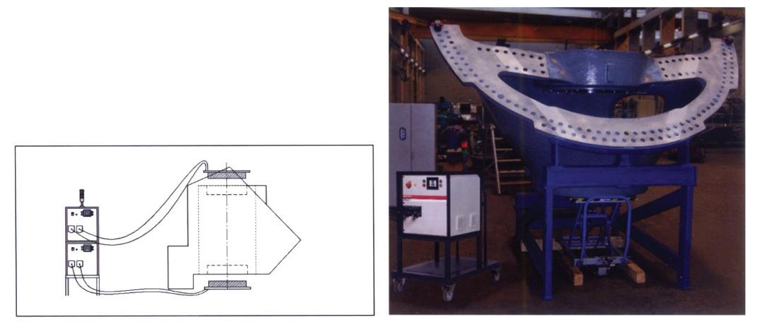 加熱方法二: ● 感應(yīng)線圈內(nèi)置于工件中加熱,熱能內(nèi)循環(huán)。 ● 例如加熱變速箱的軸承孔或者軸承座內(nèi)的孔。 ● 此款加熱器適用于加熱在鑄鐵外殼內(nèi)的軸承孔,加熱 方法的更簡(jiǎn)化更安全。 ● 圖中10000kg的鑄鐵軸承座周?chē)慕饘僭?小時(shí)內(nèi)加 熱到110度。 | ![]() |