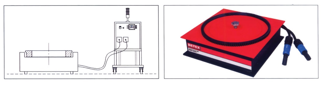 加熱方法三: ● 工件平放于感應(yīng)線圈平臺(tái)上均速可控的快速加熱,只需 很短的時(shí)間就可加熱到所需溫度,非常適用于生產(chǎn)車(chē)間 使用。 ● 例如圖中的齒輪平放于感應(yīng)線圈平臺(tái)上加熱,此款感應(yīng) 加熱器適用于較輕的工件。 ● 如下圖所示外徑400mm,內(nèi)徑360mm,厚度15mm 的齒輪可在25秒內(nèi)加熱至270度。 | ![]() |